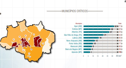 Porto Velho está entre os 10 municípios mais críticos em desmatamento, em sétimo lugar na tabela, que tem cidades conhecidas como Apuí (AM, em 1º), Colniza (MT, em 2º), Lábrea (AM, em 5º) e Novo Aripuanã (AM, no 6º lugar).
