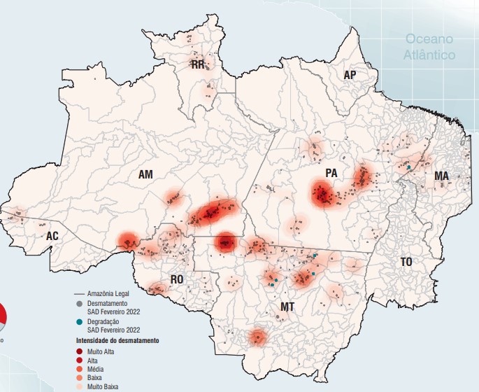 Em fevereiro de 2022, a maioria (72%) do desmatamento ocorreu em áreas privadas ou sob diversos estágios de posse. O restante do desmatamento foi registrado em Unidades de Conservação (14%), Assentamentos (13%) e Terras Indígenas (1%).