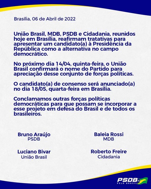 Existem três nomes e somente dois devem concorrer à chapa para a Presidência da República, como titular e vice: Sérgio Moro (União Brasil), Eduardo Leite (PSDB) e Simone Tebet (MDB).