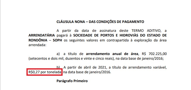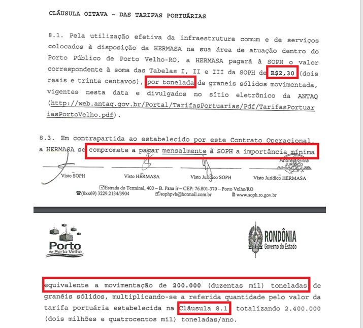 Contrato estabelecia pagamento mínimo da Hermasa ao Porto de Porto Velho/SOPH - Foto: Reprodução de documento
