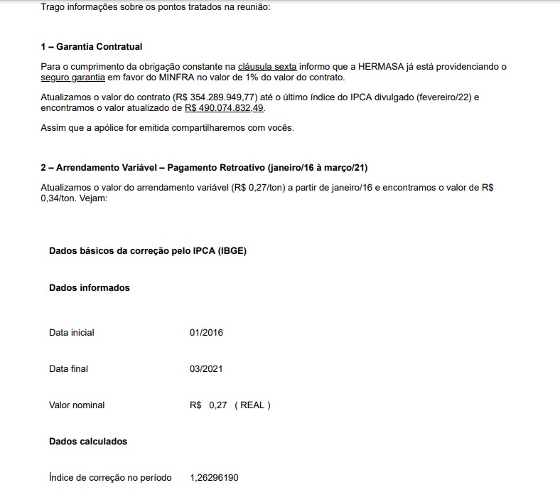 O contrato anterior previa o pagamento mínimo de 200 mil toneladas por mês ao valor de R$ 2,30 por tonelada, conforme as imagens abaixo.