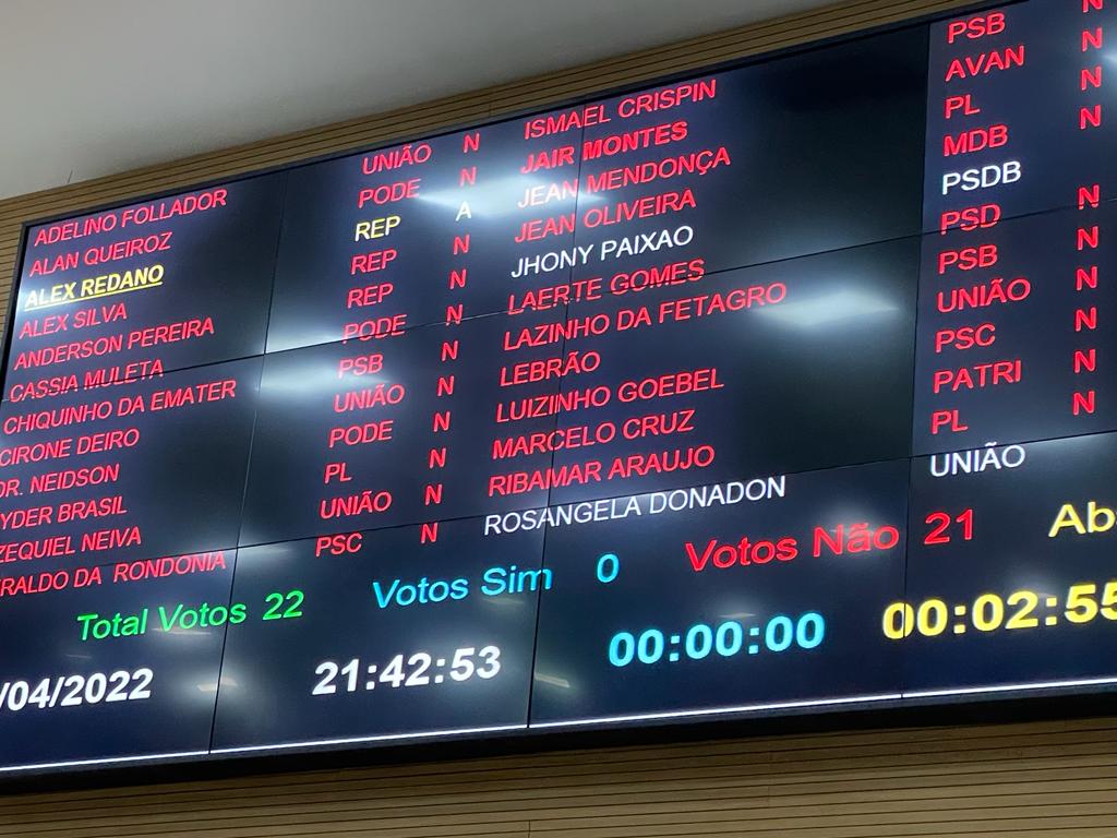 Jaílson Viana de Almeida, escolhido por Marcos Rocha, conseguiu a proeza de ter 22 votos contrários, uma abstenção regimental (Alex Redano, presidente não vota) e uma abstenção até agora sem justificativa, do deputado Jhonny Paixão.