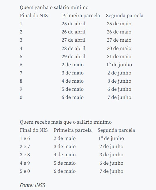 Confira o calendário de pagamento: