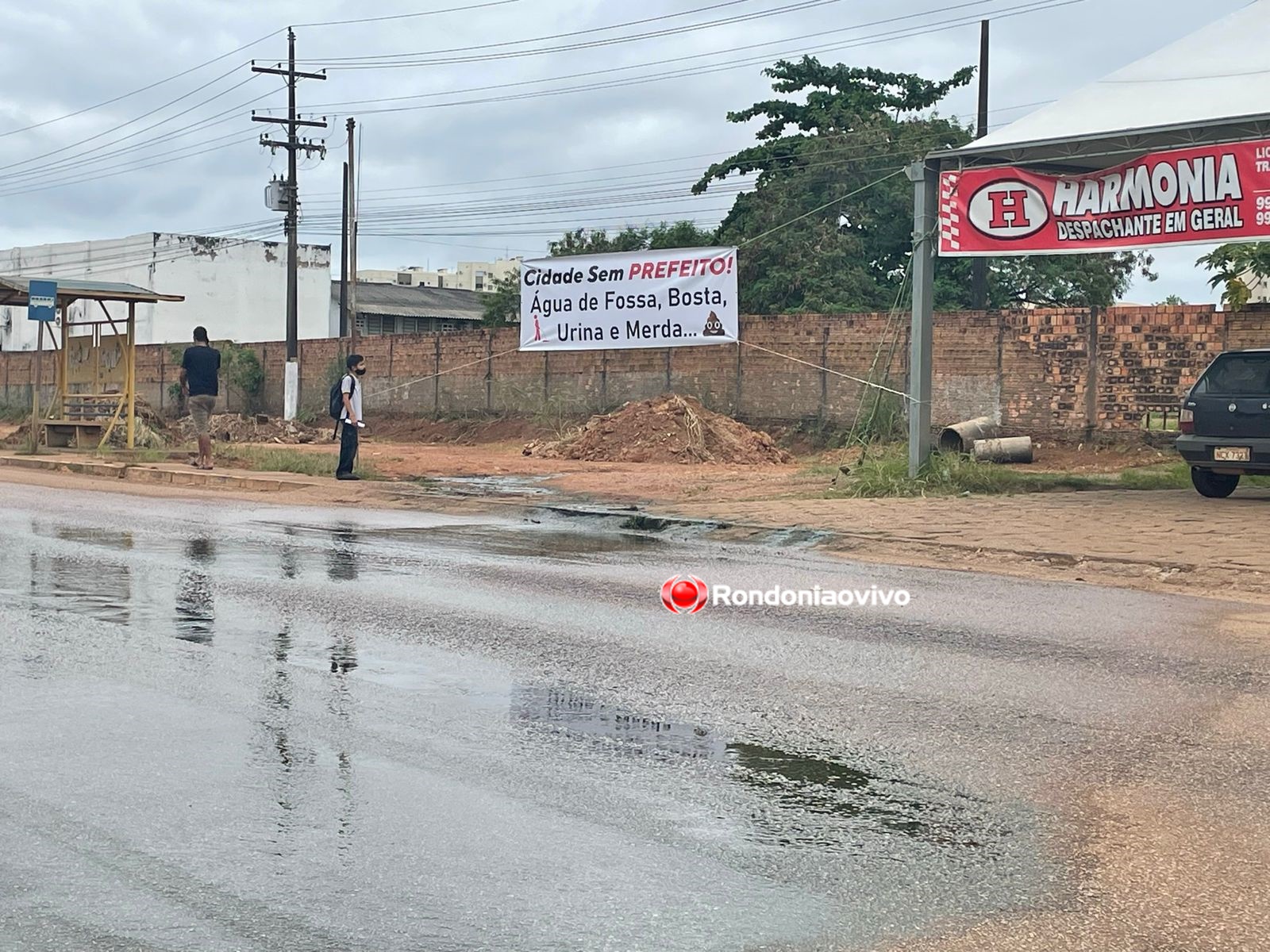 Uma faixa com os dizeres: “Cidade sem prefeito! Água de fossa, bosta, urina e merda...”, foi fixada na Avenida Imigrantes, zona Norte de Porto Velho. A insatisfação é contra uma rede de esgoto que está vazando e causando fedor insuportável no local.
