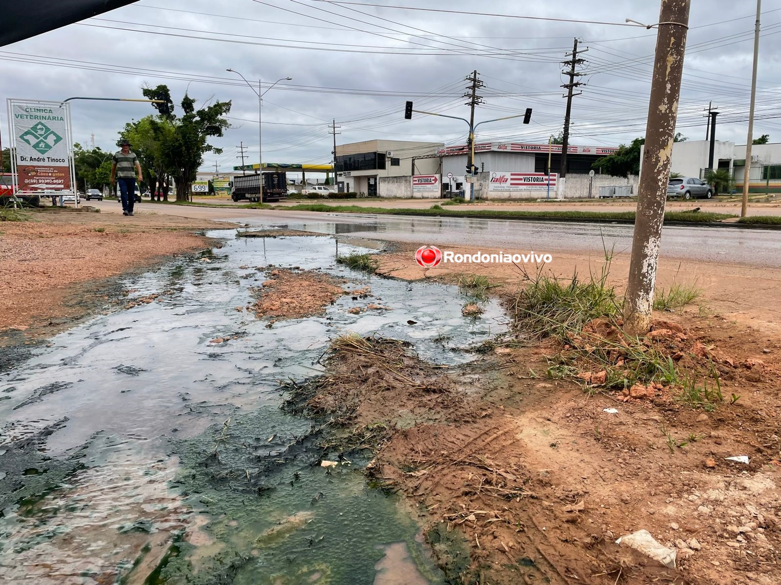 Rondoniaovivo, é possível visualizar que a água contaminada invade o asfalto da via.