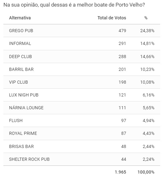 A lista é completada da seguinte forma: Barril Bar (201 – 10,23%), Vip Club (198 – 10,08%), Lux Night Pub (121 – 6,16%), Nárnia Lounge (111 – 5,65%), Flush (97 – 4,94%), Royal Prime (87 – 4,43%), Brisa Bar (48 – 2,44%) e Shelter Rock Pub (44 – 2,24%).