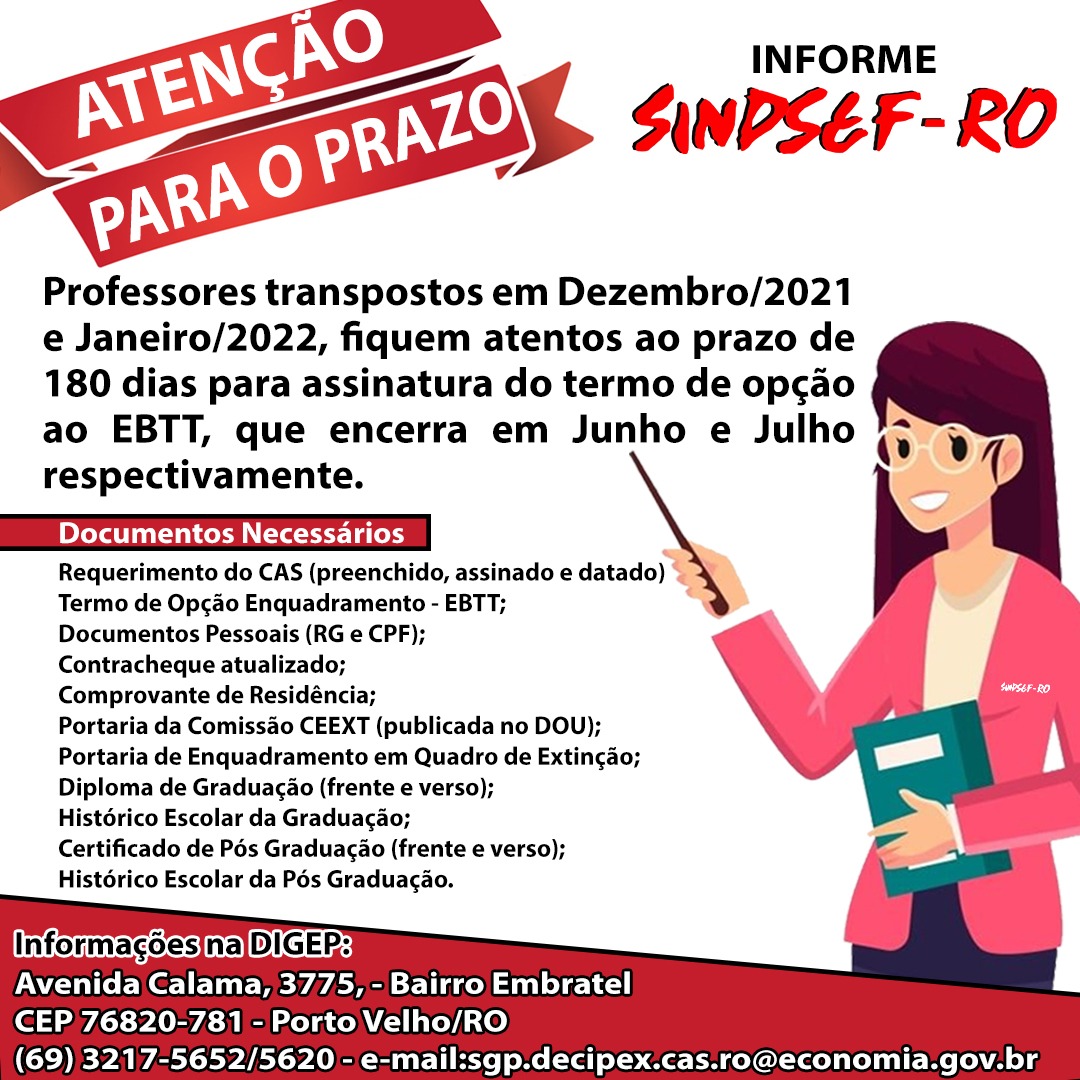 O Sindicato dos Servidores Públicos Federais no Estado de Rondônia – Sindsef/RO alerta aos professores com graduação de nível superior, que tiveram o enquadramento na transposição concedido nas portarias do Diário Oficial da União em dezembro de 2021 e janeiro de 2022 para ficarem atentos a proximidade do final do prazo para procederem com a assinatura do termo de opção para a carreira de magistério do Ensino Básico, Técnico e Tecnológico – EBTT.