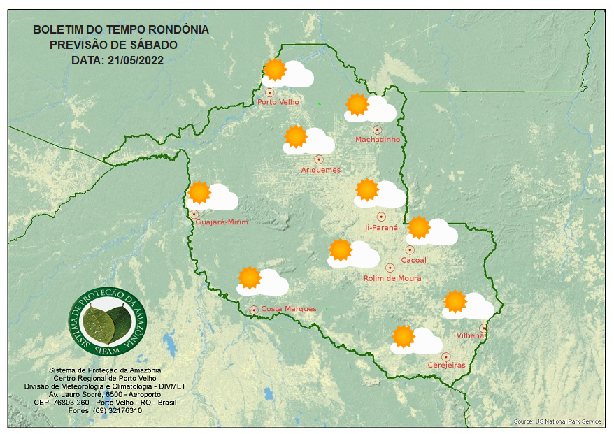 A Divisão de Meteorologia do Sistema de Proteção da Amazônia (Sipam) informa que neste sábado (21), o clima é de sol e temperaturas elevadas em Rondônia.