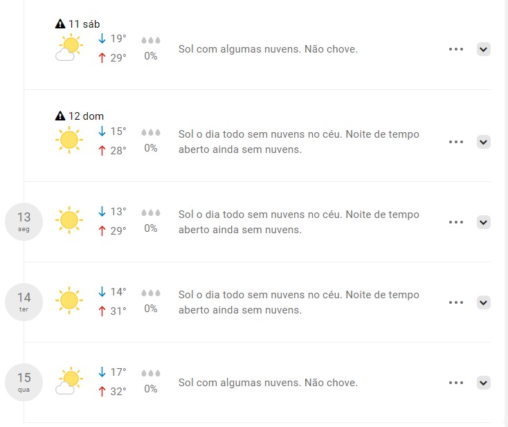 Na segunda (13), o ápice do geladinho na capital: mínima de 13°C e máxima de 29°C, de acordo com a Climatempo. E as temperaturas amenas seguem pelo menos até a quarta-feira (15), com o último dia da “friagem”: mínimo de 17°C e máxima de 32°C.
