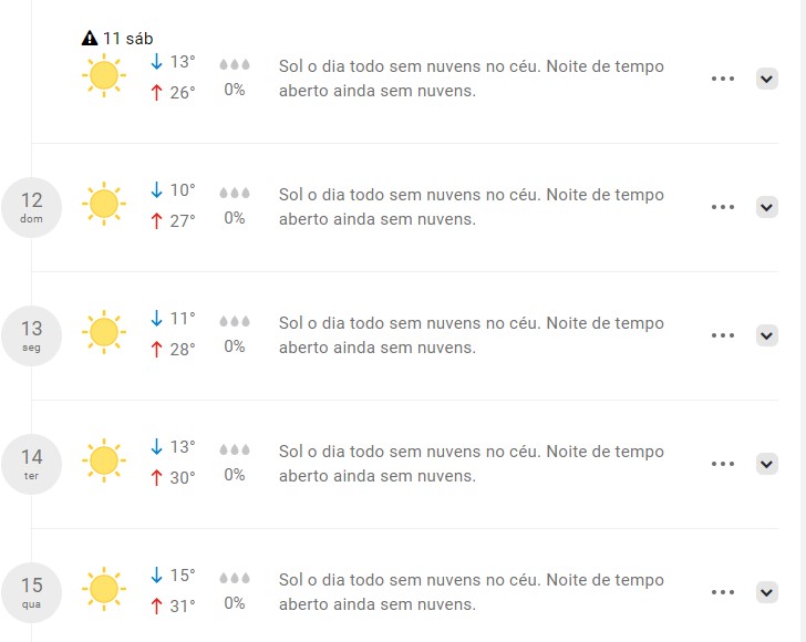 No domingo, início do dia com 10°C. Na segunda-feira, registro de 11°C. As temperaturas seguem mais amenas até a quarta-feira, quando Vilhena terá mínima de 15 e máxima de 31°C.