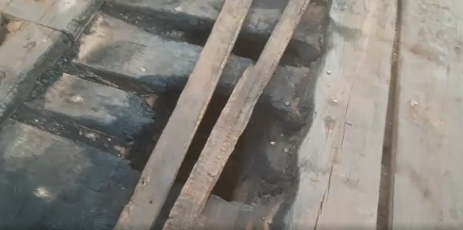 Duas pequenas ripas cobrem um dos buracos na ponte do Rio Preto - Foto: Reprodução de Vídeo