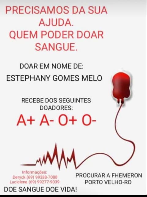 Uma mobilização na internet que iniciou está pedindo doações de sangue em nome de Estephany Gomes Melo, que pode receber sangue dos tipos A+, A-, O+ ou O-.