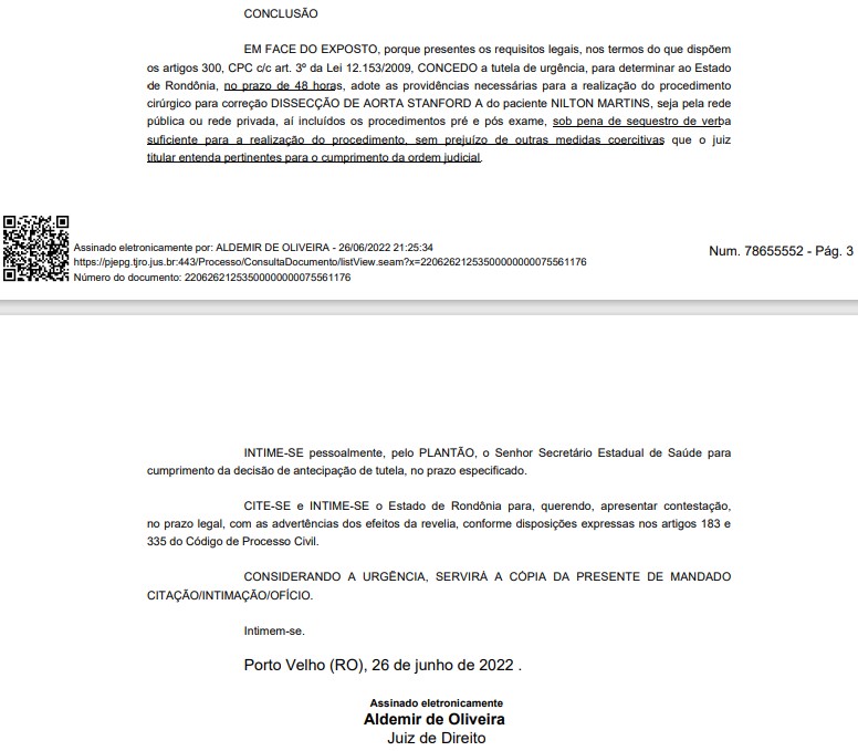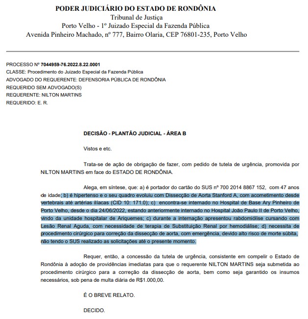 Rondoniaovivo para informar "que no dia 28 de junho [conforme print da decisão, foi no dia 26 de junho - domingo], o 1° Juizado Especial da Fazenda Pública de Porto Velho, determinou que o Estado de Rondônia fornecesse a cirurgia cardíaca do paciente N. M de 47 anos que estava internado no Hospital de Base".