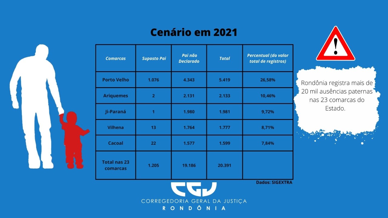 A Corregedoria-Geral da Justiça de Rondônia apresentou um relatório que mostra a triste realidade em relação ao número de registros de nascimentos sem o nome do pai. Mais de 20 mil crianças foram registradas no Estado sem o reconhecimento paterno em 2021. O levantamento foi feito por meio do Sistema de Informações Gerenciais do Extrajudicial (Sigextra).