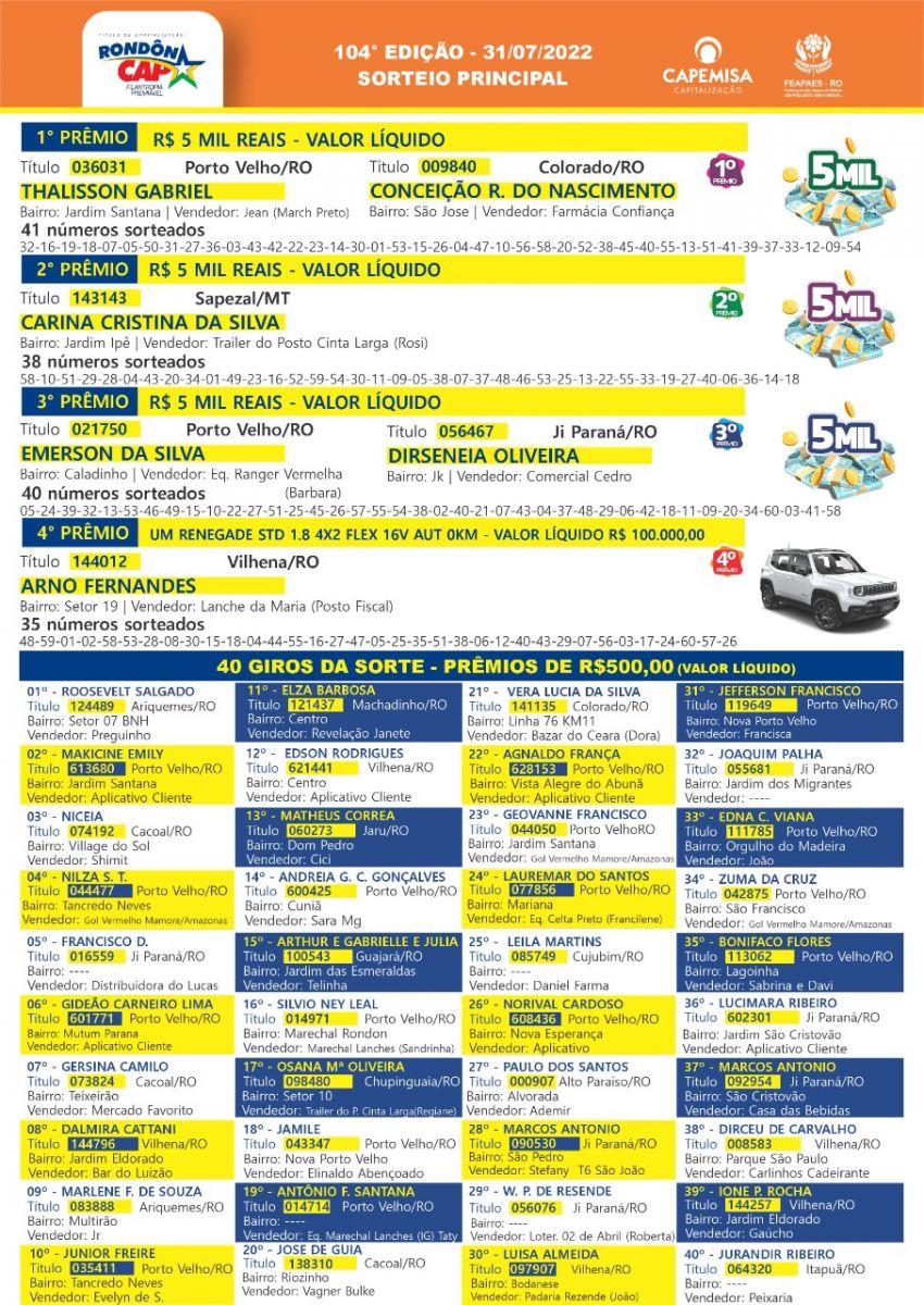 Quem ganha no Rondôncap todo mundo vê, conheça agora os ganhadores do último domingo: