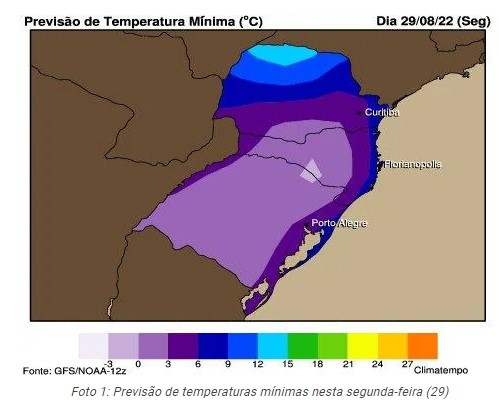Na segunda-feira (29), devido ao posicionamento do ar polar, o frio aumenta em todas as áreas da região Sul, com risco de temperaturas mínimas entre 0 e 6°C desde o Rio Grande do Sul até o centro paranaense, e valores negativos nas serras gaúcha e catarinense. A segunda-feira (29) tende a ser o dia mais gelado desta onda de frio.