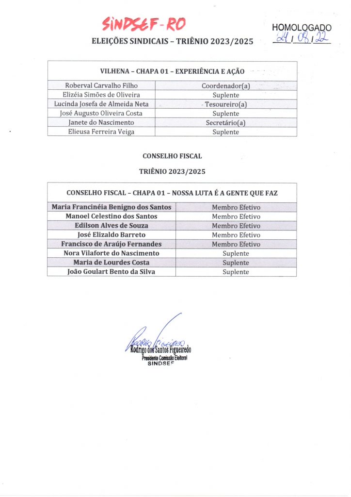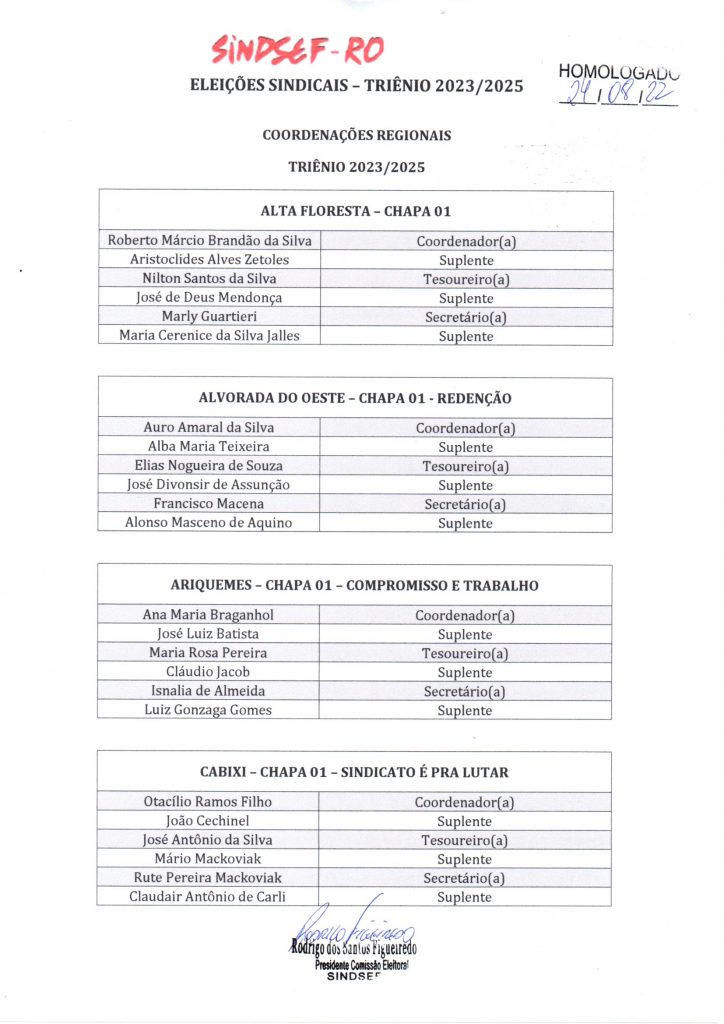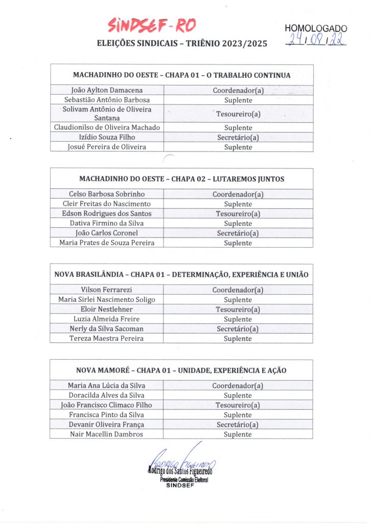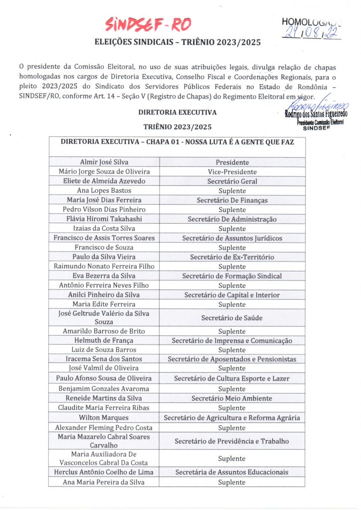 Encerrado o prazo para registro de chapas, análise e homologação, a Comissão Eleitoral informa que a Eleição do Sindicato dos Servidores Públicos Federais no Estado de Rondônia - Sindsef/RO para o triênio 2023/2025 teve chapa única para Diretoria Executiva, Conselho Fiscal e em 19 Coordenações Regionais. Apenas em Machadinho do Oeste terá votação presencial para escolha das chapas concorrentes, a ser realizada no dia 30 de setembro.