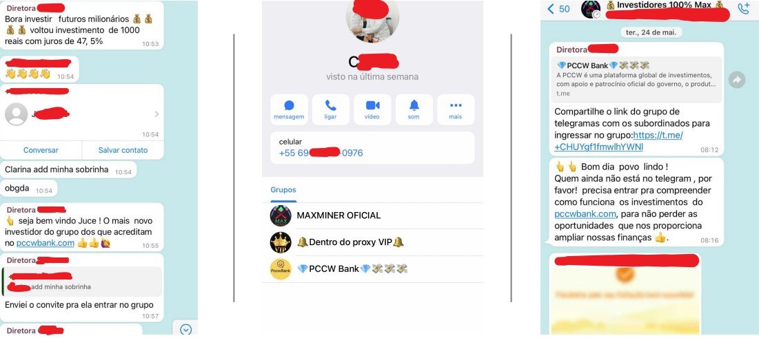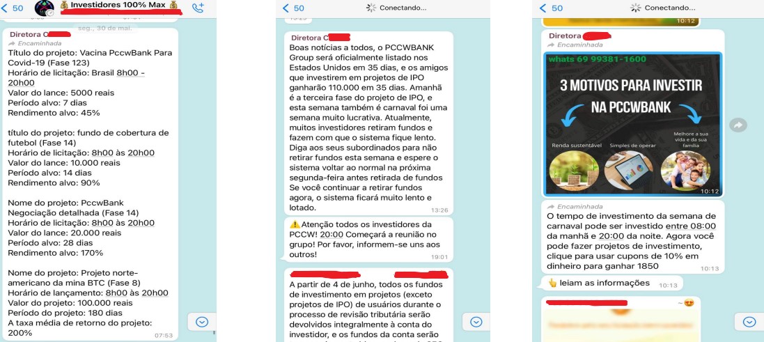 A própria diretora C. encaminhava em grupos do Telegram, diversos comunicados da “chefia maior” (como ela mesmo se referia à pessoas que operavam a pirâmide acima dela), com possibilidades de investimentos iniciais, tempo possível e rendimentos.