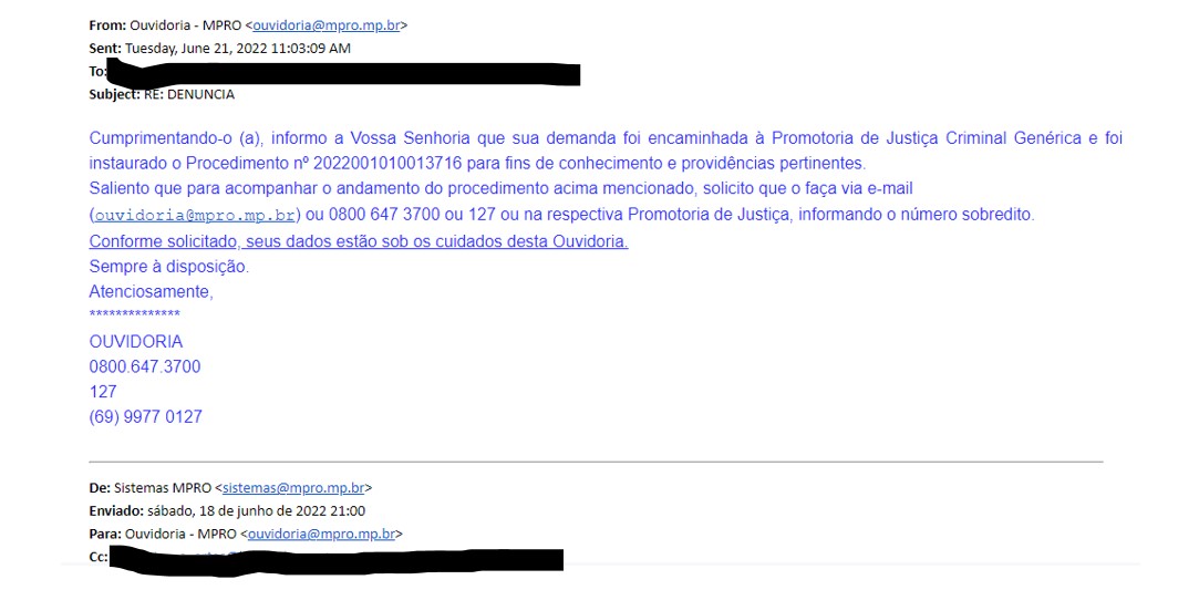 A reportagem teve acesso a um e-mail que respondeu a denúncia feita pelo grupo, que informou que “a demanda foi encaminhada à Promotoria de Justiça Criminal Genérica e foi instaurado o procedimento nº 2022001010013716 para fins de conhecimento e providências pertinentes”.