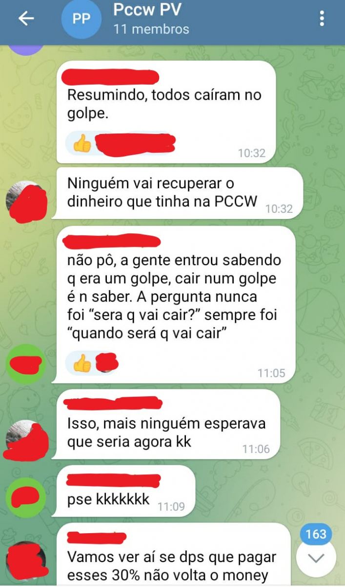 E já conformadas com o “tombo” que levaram, criaram até um grupo no mesmo Telegram, onde foram seduzidas com os milagres financeiros da PCCW Bank.