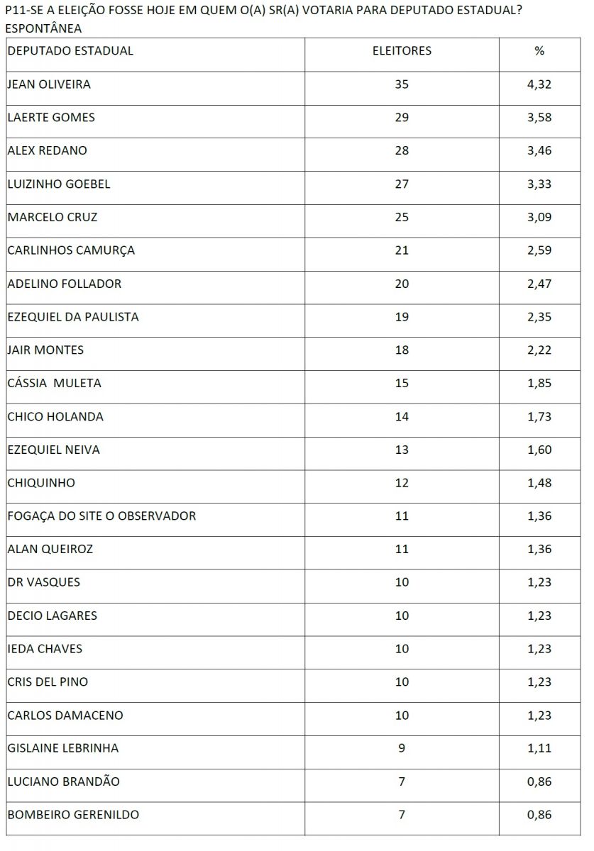 Os deputados estaduais Jean Oliveira (4,32%), Laerte Gomes (3,58%), Alex Redano (3,46%), Luizinho Goebel (3,33%) e Marcelo Cruz (3,09%) aparecem nas cinco primeiras posições com as maiores intenções de voto na pesquisa.