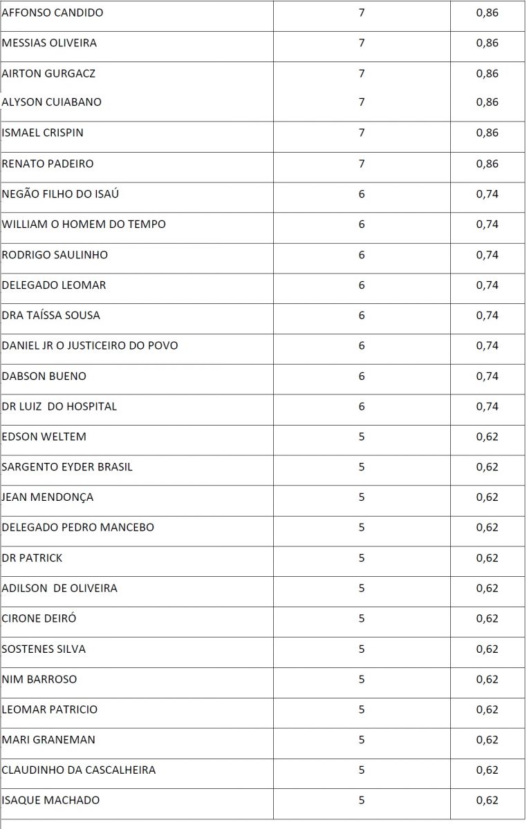 Até a 24ª. posição, ainda temos: Carlos Damasceno (1,11%), Luciano Brandão, Gislaine Lebrinha, Affonso Cândido e Bombeiro Gerenildo, empatados com 0,86%.