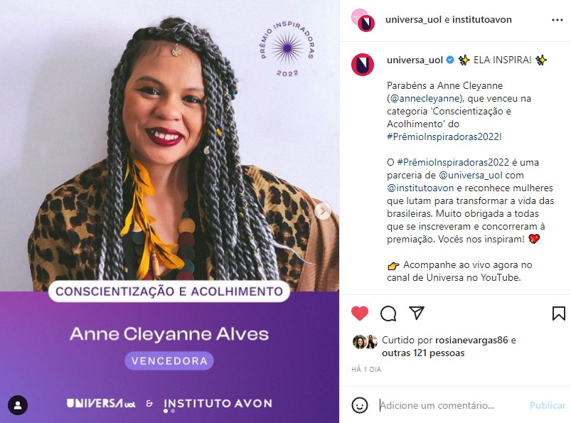 No dia em que recebeu o prêmio e o reconhecimento nacional, tanto dos leitores do UOL quanto dos jurados, Anne Cleyanne lembrou de sua mãe, que também lutou para que outras mulheres tivessem suas vozes ouvidas sempre.