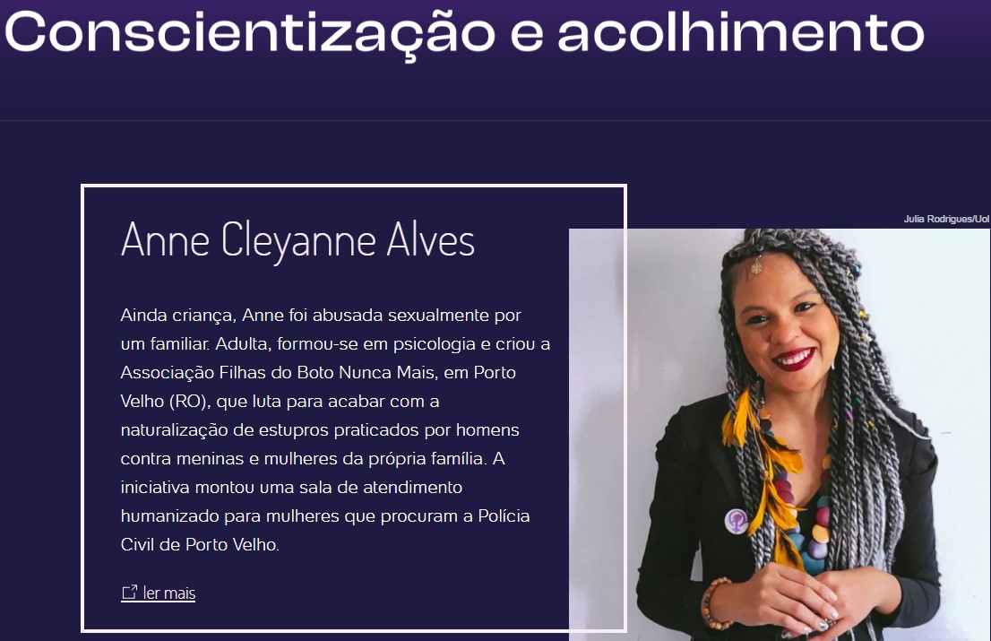 Ainda criança, Anne foi abusada sexualmente por um familiar. Adulta, formou-se em psicologia e criou a associação em Porto Velho. Com 52 voluntárias, a ONG luta para acabar com a naturalização da violência sexual praticada por homens contra meninas e mulheres da própria família.