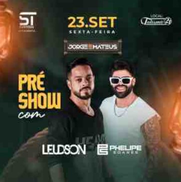 O show do ano é o maior sucesso de vendas. A dupla Jorge e Mateus se apresenta nesta sexta-feira (23), na casa de shows Talismã 21 e a ST Eventos, empresa que organiza o evento, informou que os INGRESSOS ESTÃO ESGOTADOS.