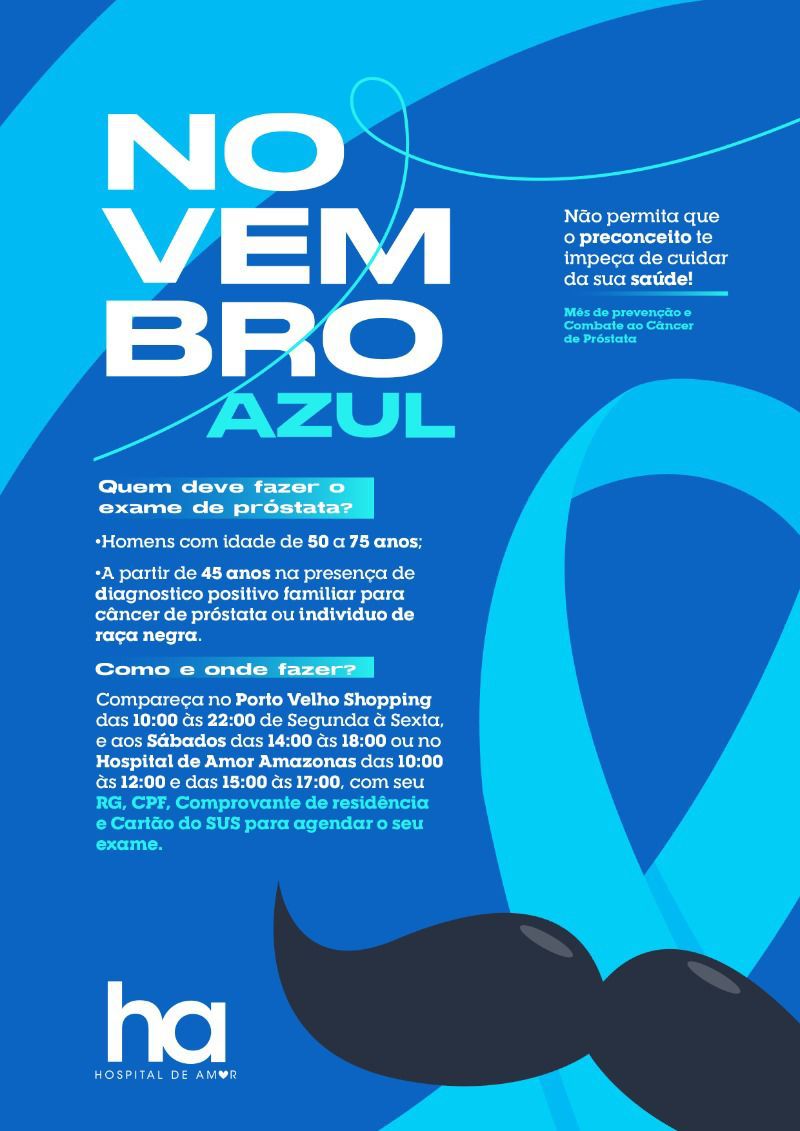 A equipe de prevenção do Hospital de Amor da Amazônia, começou no último dia 03 e vai até o dia 31 de outubro, o agendamento de exames e consultas de forma gratuita. Os exames que estão sendo agendados são a coleta do PSA (Prostate Specific Antigen), e também está sendo marcado a consulta com a equipe de urologia do hospital.