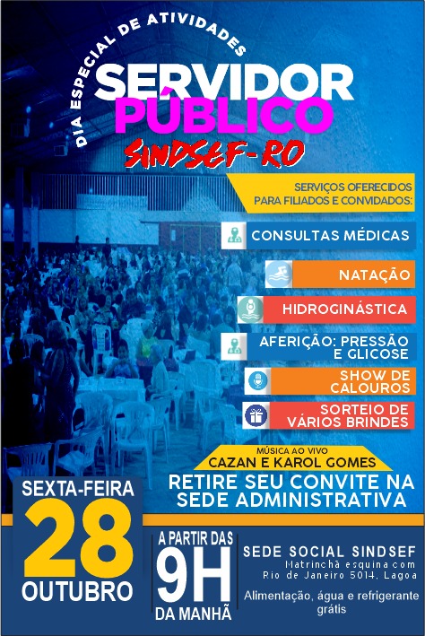 O dia 28 de outubro, sexta-feira, será marcado por atividades e sorteios de brindes na Sede Social do Sindsef em Porto Velho e nas Coordenações Regionais.