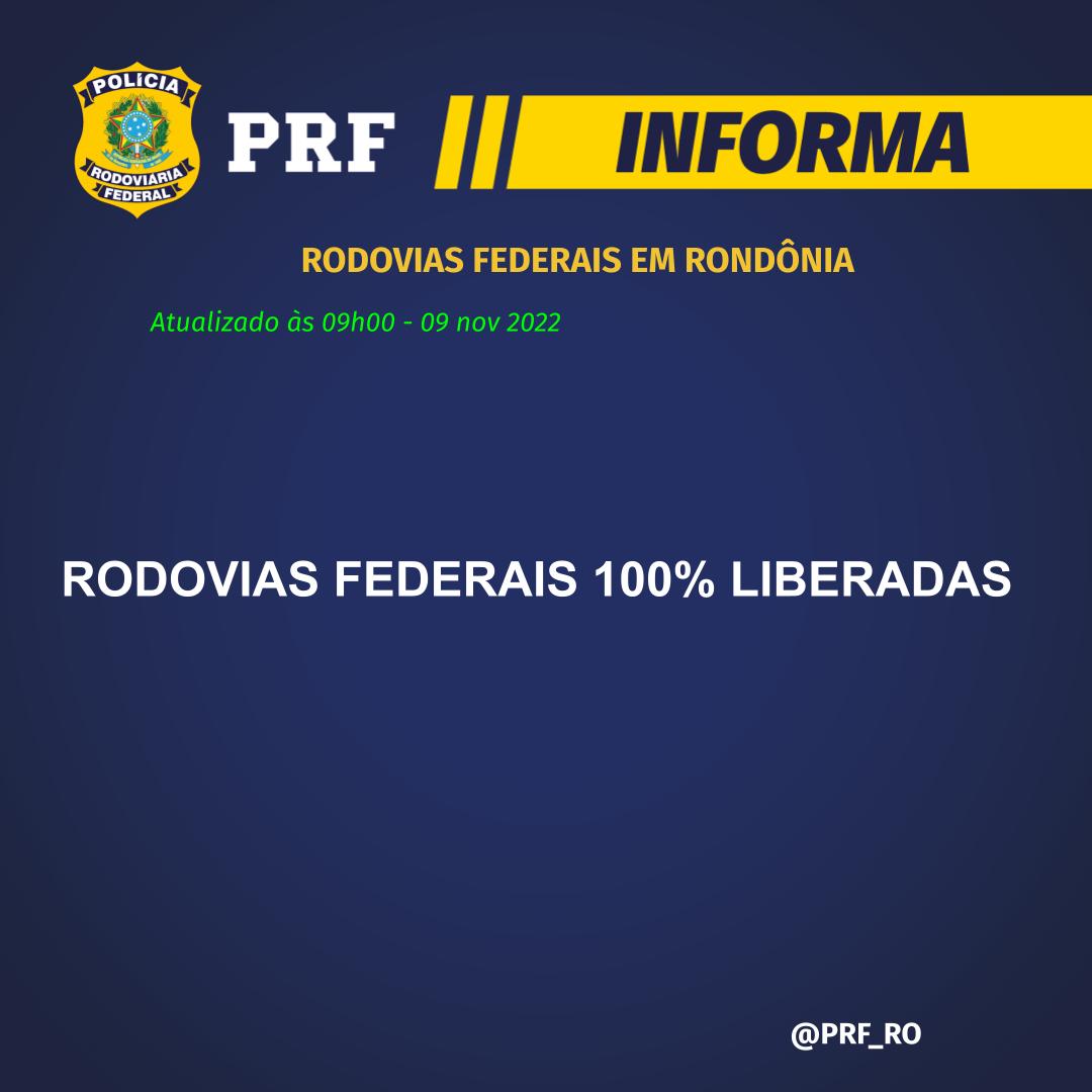 Segundo boletim da Polícia Rodoviária Federal (PRF) divulgado por volta das 09 da manhã desta quarta-feira (09), 100% de todas as rodovias federais brasileiras estão liberadas.