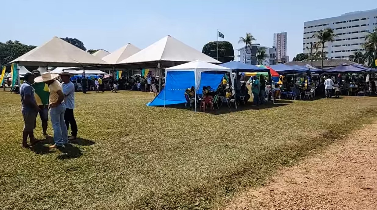 Os apoiadores da extrema-direita montaram um verdadeiro acampamento com direito à praça de alimentação, holofotes portáteis, dezenas de ambulantes e banheiros químicos instalados no gramado que está sob responsabilidade do Exército na Capital de Rondônia.