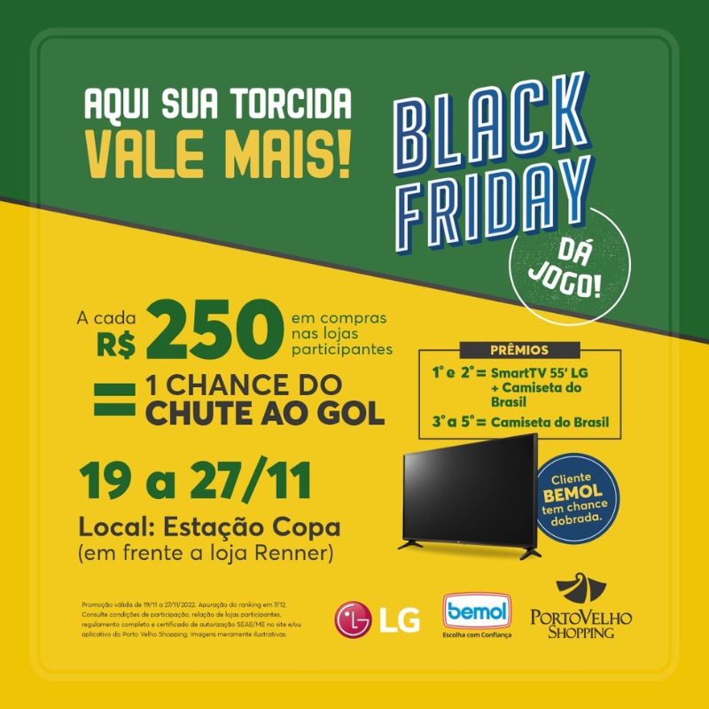 Os jogos da copa estão chegando e o Porto Velho Shopping veste as cores verde e amarelo para reforçar a torcida pela seleção brasileira que busca o hexa. E quem ganha é o torcedor que comparece ao shopping, pois durante o mês de novembro, a Ancar Ivanhoe promove um Black Friday diferenciado e que envolve a promoção “Gol Premiado”.