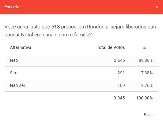 O Rondoniaovivo fez uma enquete com a seguinte pergunta: ‘Você acha justo que 518 presos, em Rondônia, sejam liberados para passar o Natal em casa com a família?’. O objetivo era saber se os internautas, concordam com o direito dos detentos a deixarem presídios nesse período de festas.