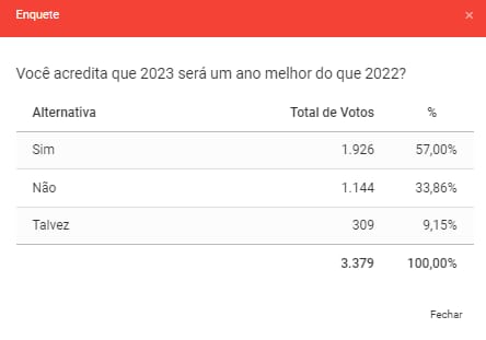 Os que estão meio desconfiados e talvez acreditam que 2023 pode ser bom, somaram 309 votos ou 9,15%.
