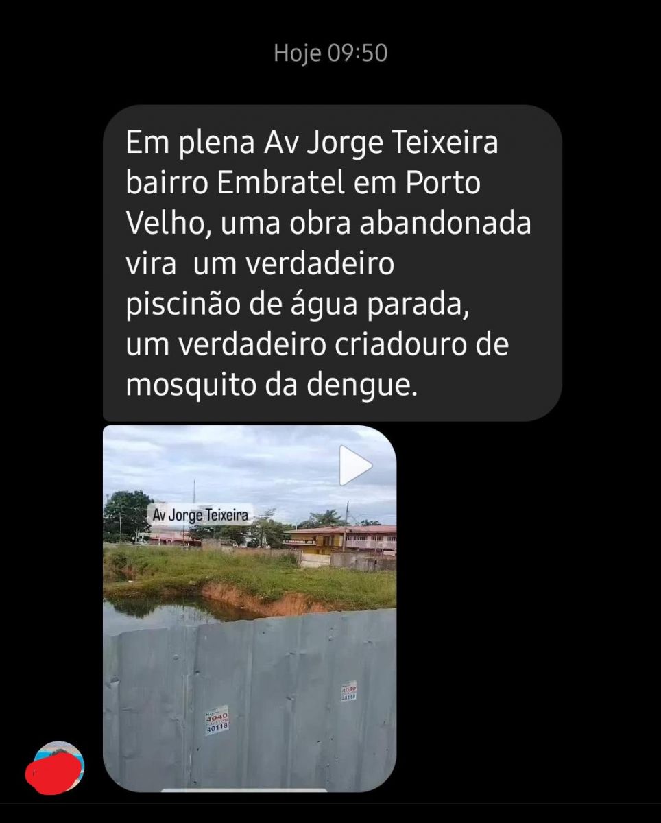 “Em plena Avenida Jorge Teixeira, Bairro Embratel, em Porto Velho, uma obra abandonada vira um verdadeiro piscinão de água parada, um verdadeiro criadouro de mosquito da dengue”, desabafou um leitor do jornal eletrônico.