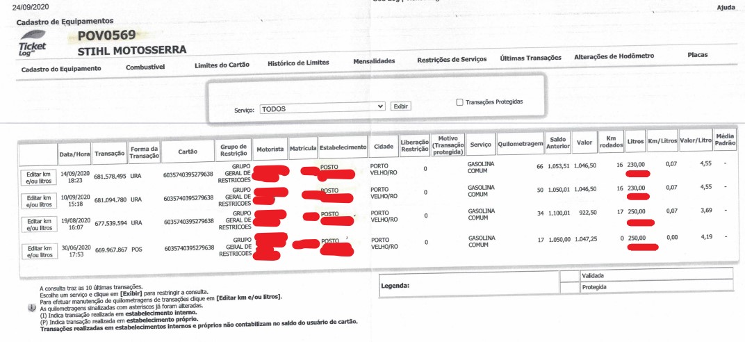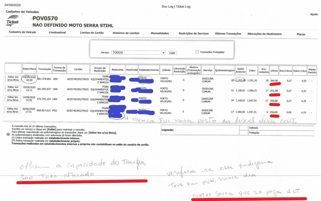 Segundo documentos, uma motosserra que cabe apenas 2 litros de gasolina, recebeu quase 300 litros do produto