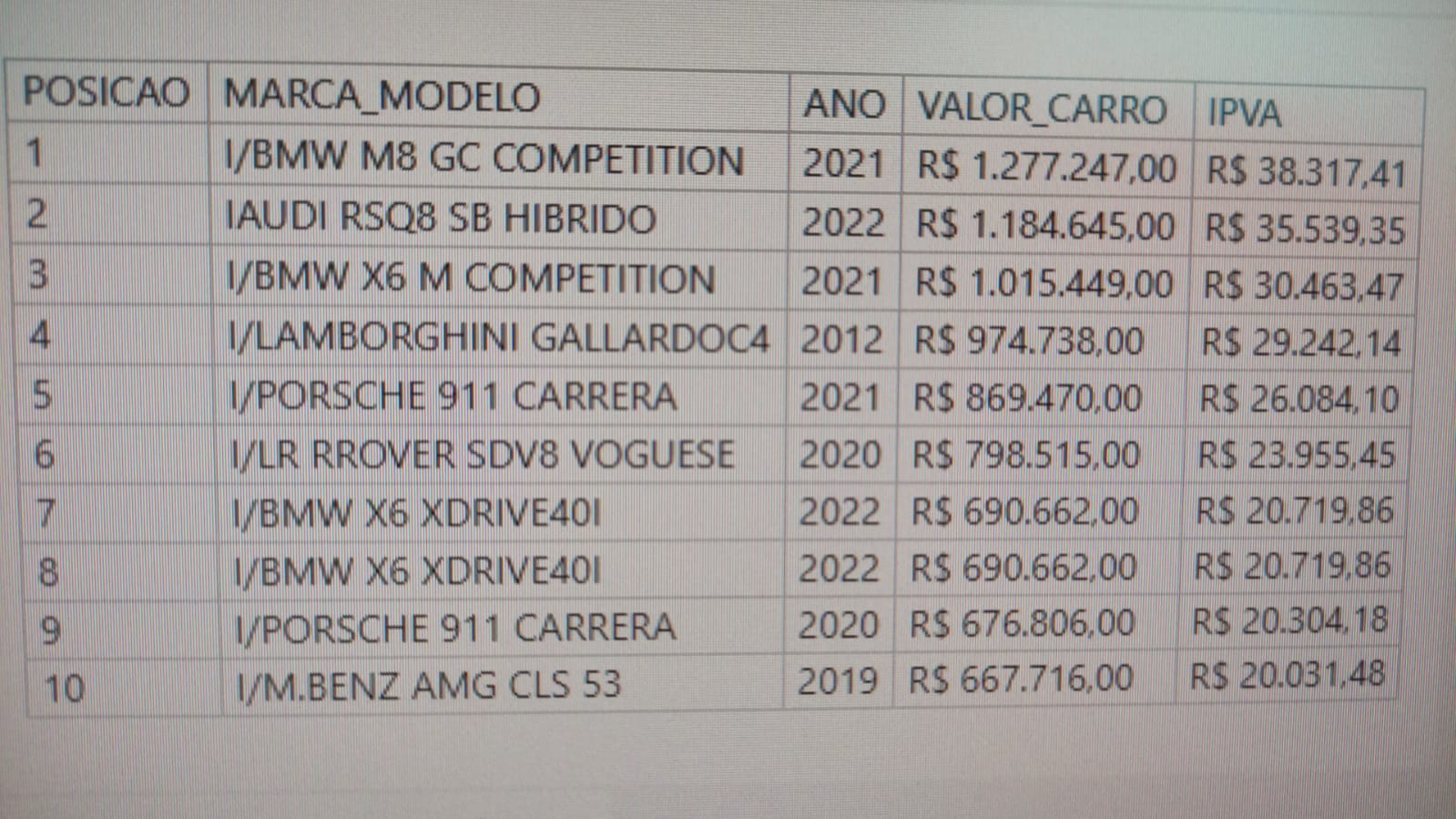 "Top 10" dos carros com IPVAs mais altos de Rondônia, segundo a Sefin - Foto: Reprodução de tela