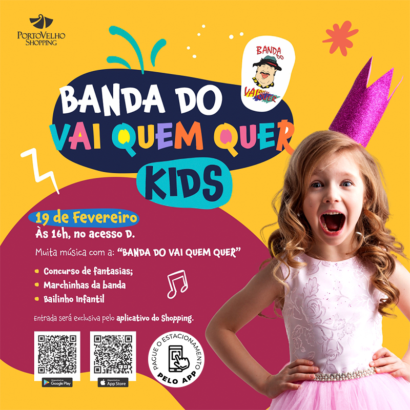 O Porto Velho Shopping vai se transformar em um verdadeiro bloco carnavalesco, isso porque, no domingo (19), o empreendimento recebe a “Banda do Vai Quem Quer Kids”, a partir das 16h. A matinê vai contar com Concurso de Fantasias, marchinhas com repertório da “Banda da Banda”, baile infantil e oficina de máscaras. O evento acontece no Espaço de Eventos do Acesso D.