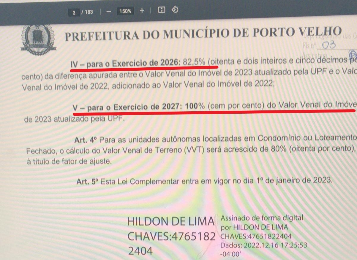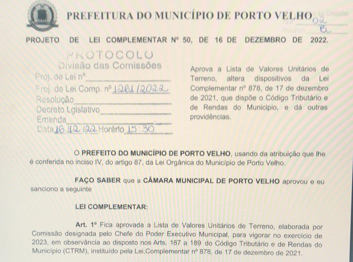 Lei municipal aprovada em tempo recorde pelos vereadores e que aumentou o IPTU em Porto Velho em 100%, no papel