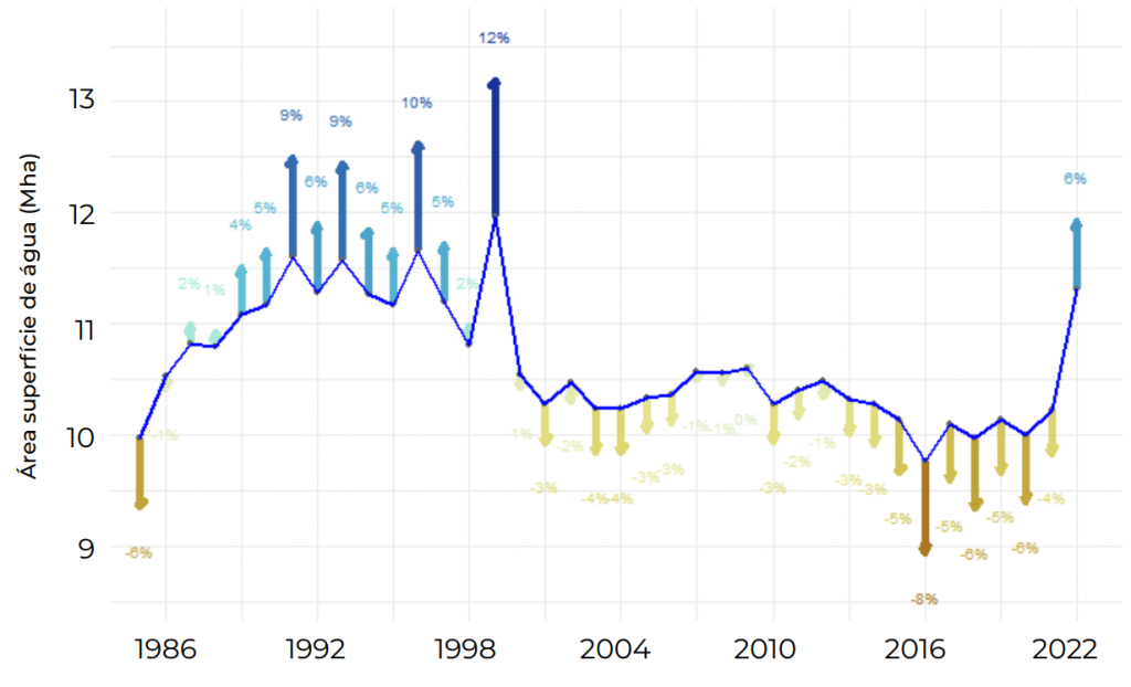 Enquanto em 2021 a superfície de água na Amazônia ficou 4% abaixo da média, em 2022 estava 6% acima. Ou seja: uma oscilação de 11 pontos percentuais entre um ano e outro.