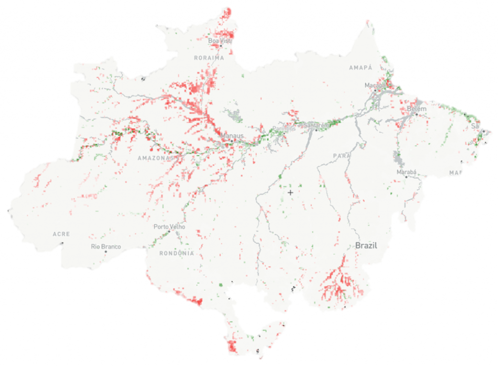 Imagem mostra onde a Amazônia perdeu água (em vermelho) e onde ganhou (em verde) de 1985 a 2022 (Imagem: MapBiomas Água)