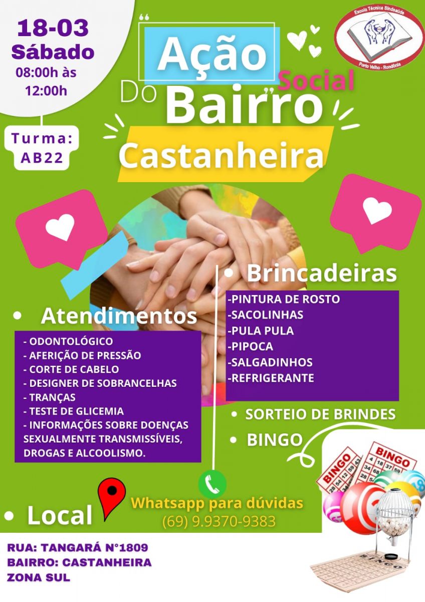 Os moradores do bairro Castanheira, terão acesso no próximo sábado (18) a diversos atendimentos gratuitos, através da ação social realizada por alunos da Escola Técnica Sindsaúde. O evento em parceria com a Associação do Bairro, irá acontecer na rua Tangará, 1809, das 8h às 12h na zona Sul de Porto Velho.