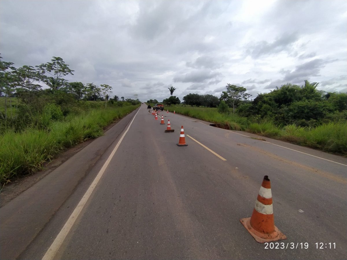 Devido a erosão causada pela grande quantidade de água em um igarapé, a tubulação do bueiro não suportou a vazão e o asfalto acabou rompendo. A rodovia foi interditada após uma análise feita por engenheiros do Dnit.