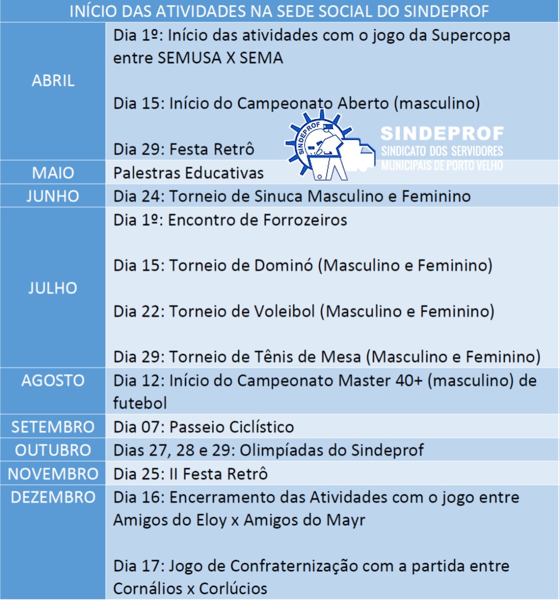 Ainda em abril estão previstos para ocorrer, no dia 15, o início do Campeonato Aberto masculino e, no dia 29, a tradicional festa Retrô 2023. Uma das principais atividades esportivas, as Olimpíadas do Sindeprof ocorrem dias 27, 28 e 29 de outubro.