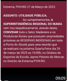 Famílias que moram na Ponta do Abunã, região formada por vários distritos pertencentes a Porto Velho, estão preocupadas com uma suposta audiência pública que teria sido convocada pelo Ibama (Instituto Brasileiro do Meio Ambiente e Recursos Naturais) para esta quarta-feira (29), às 10 da manhã, no ginásio da Escola Jayme Peixoto de Aguiar, em Extrema.