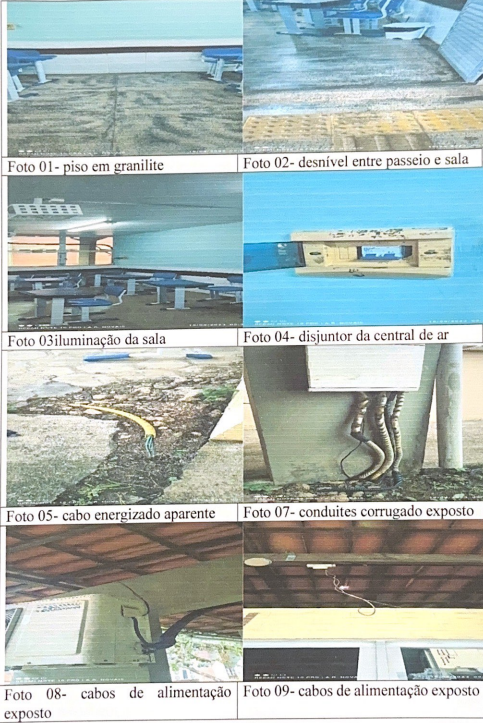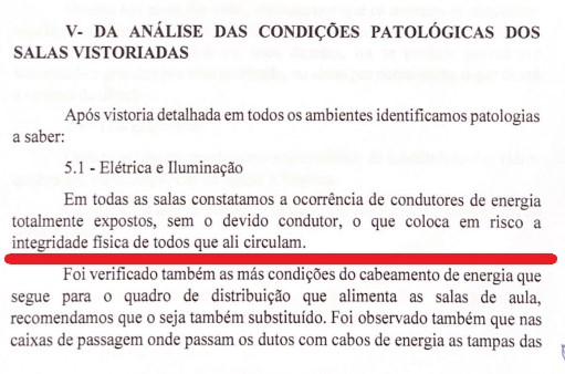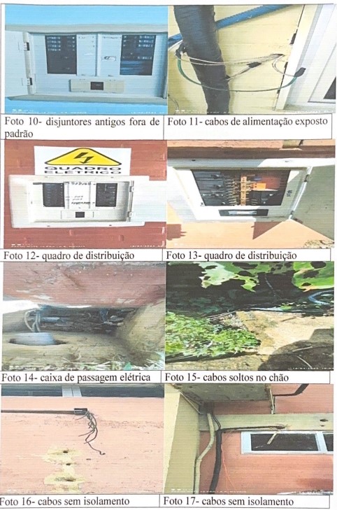 “Em todas as salas constatamos a ocorrência de condutores de energia totalmente expostos, sem o devido condutor, o que coloca em risco a integridade física de todos que circulam ali”, destacou a análise.