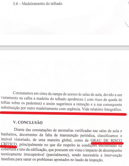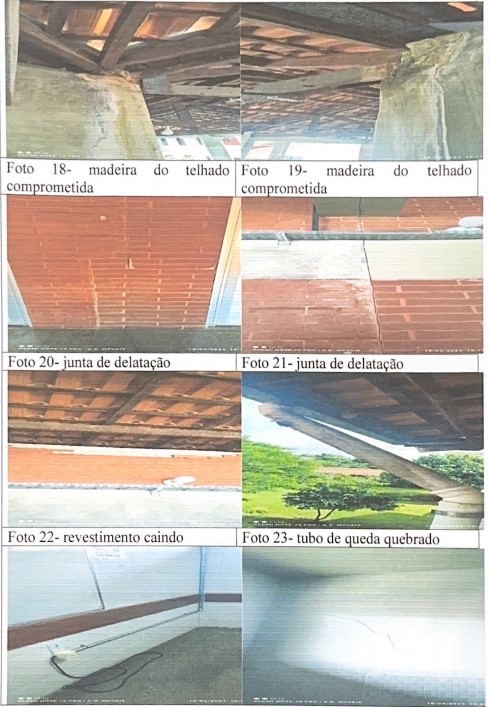 Outro ponto que causou bastante alerta é o madeiramento do telhado dos blocos: “Constatamos em cima da rampa de acesso às salas de aula, devido a um vazamento na calha, a madeira do telhado apodreceu (com risco de queda de telhas sobre os pedestres) e assim sugerimos a remoção e a consequente substituição por outro madeiramento com urgência”.