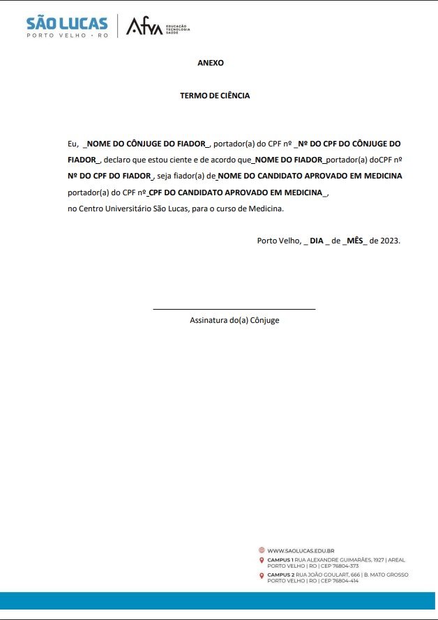 • Certidão de Nascimento atualizada – para solteiro (a); ou Certidão de Casamento - caso seja casado (a), atualizado + o RG e CPF do (a) cônjuge + termo reconhecido em cartório expressando ciência de que seu cônjuge será fiador (ANEXO );